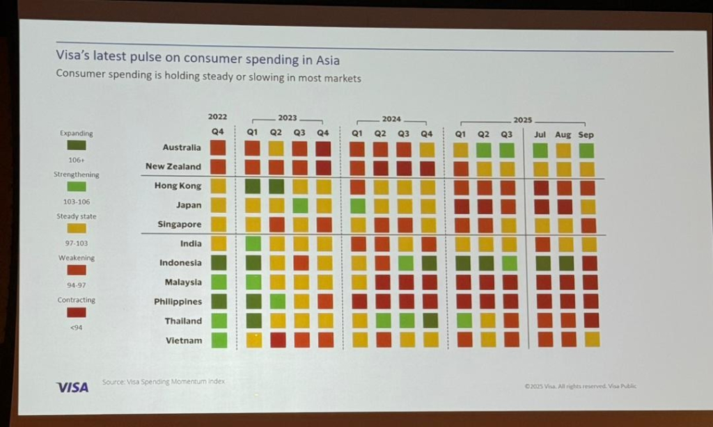 A thought-provoking moment came during a session that highlighted Visa’s Spending Momentum Index across Asia. Despite strong FDI and GDP growth, Malaysia showed signs of contraction in consumer spending.